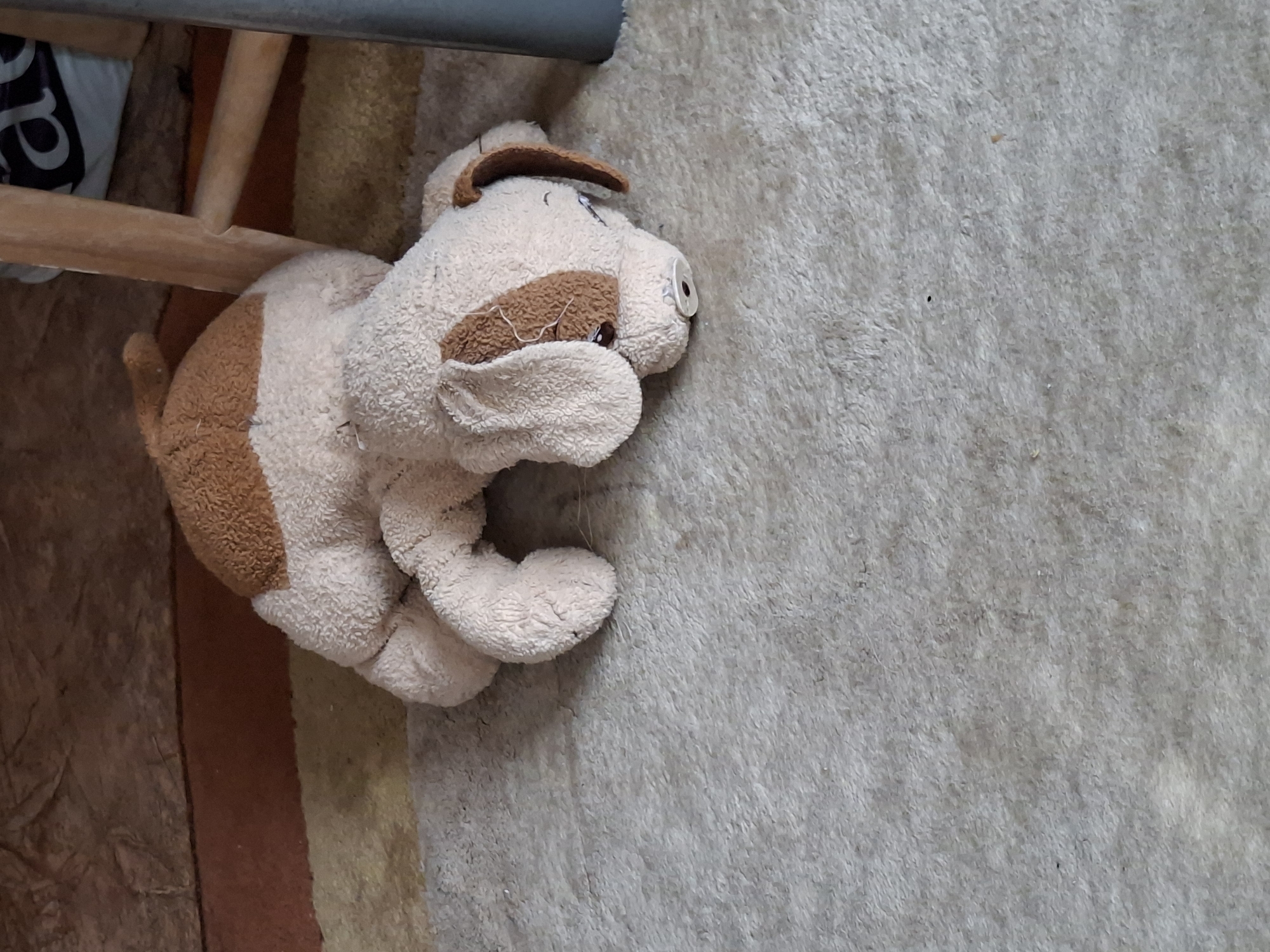 stuffed dog toy lying on a beige carpet. Part of a wooden chair is visible in the upper left corner. The toy is tan and brown, with a button eye. The location in the city of Blagoevgrad, Bulgaria is unknown.