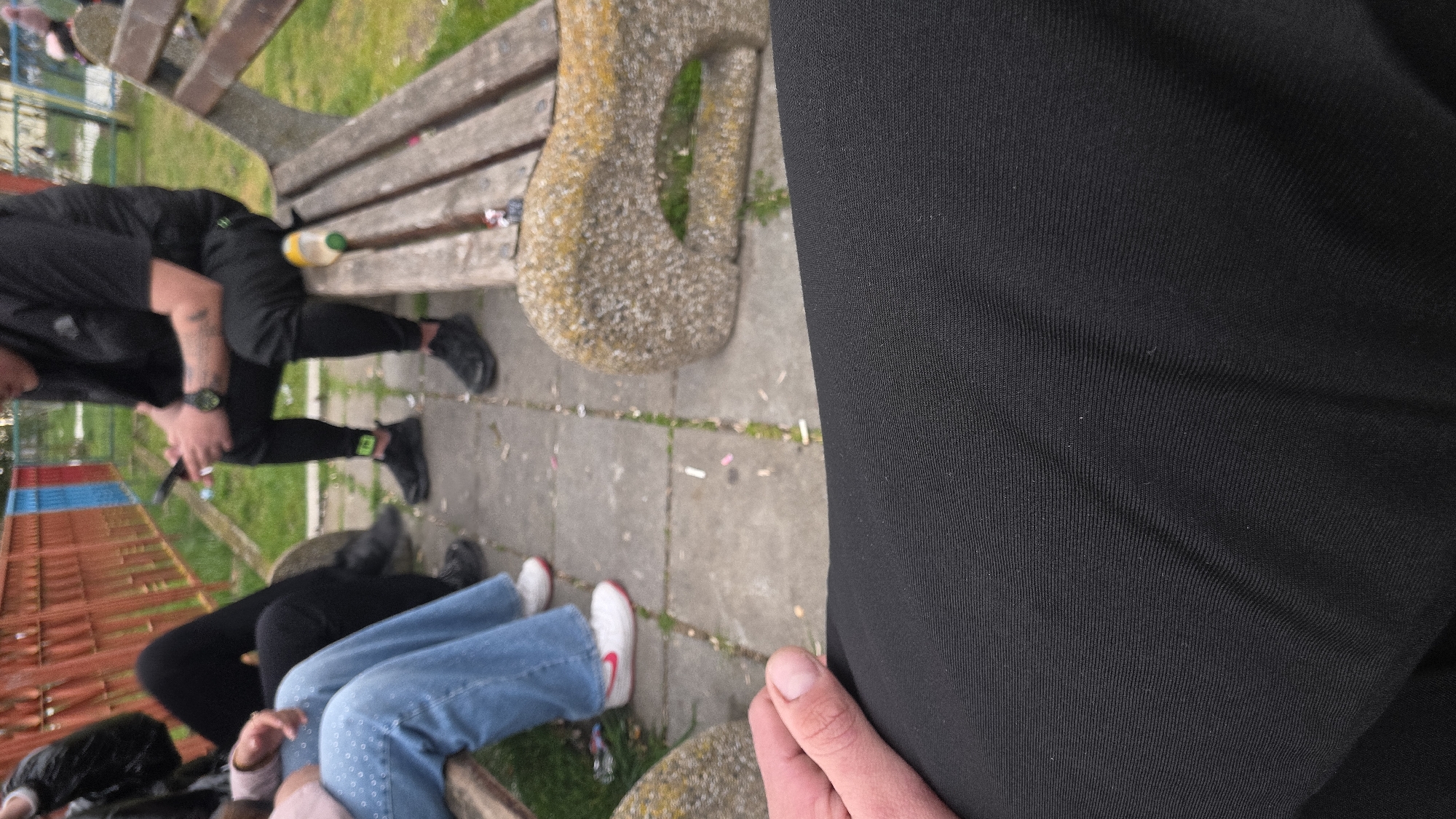 People are sitting on park benches, some smoking. The location appears to be a park, potentially in the city of Kavarna, Bulgaria. Cigarette butts litter the ground. The image is taken from a first-person perspective. One person is wearing blue jeans and sneakers, while another is wearing black athletic wear. There are various items on the bench, potentially litter or possessions. The general environment appears unkempt.