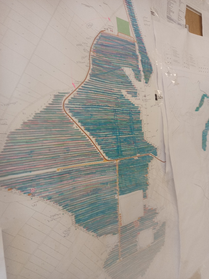 A large, light-colored paper map or cadastral plan is affixed vertically to a wall in Drugan, Bulgaria, secured by transparent adhesive tape visible in the upper right quadrant. The map details a landscape divided into numerous plots, many of which are filled with horizontal marker strokes in teal, blue, and sporadic pink hues. Brown-orange lines, indicative of roads or pathways, intersect and traverse these colored zones. Various handwritten alphanumeric notations and Cyrillic text, including "СУМ" and "ТЕЦ," are present on the map, suggesting measurements, plot identifiers, or project-related information. Several small green rectangles are drawn within certain areas. A separate, uncolored white paper sheet is partially overlaid on the right side of the main map, also secured by tape, and displays a few smaller, irregularly shaped green markings. The surface behind the maps appears to be a light-colored wall. No individuals are visible.