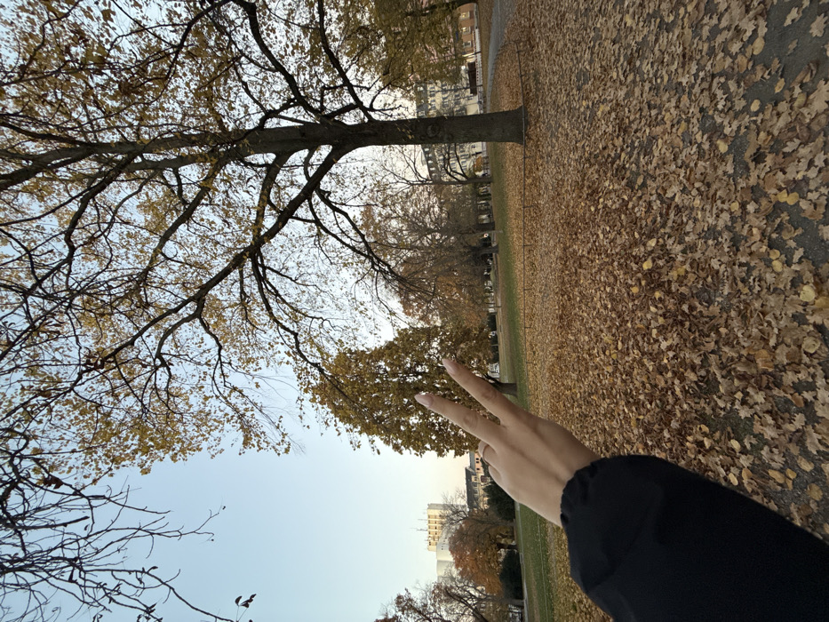 The image depicts an outdoor park scene in Riesa, Germany, during autumn. A human left arm, clad in a black long-sleeved garment, extends from the lower-left corner, with the hand forming a 'V' gesture using the raised index and middle fingers. The fingernails exhibit a light-colored polish. The ground is densely covered with dry, fallen deciduous leaves primarily in shades of brown and yellow, with some patches of visible green grass. Numerous deciduous trees with sparse autumnal foliage and bare branches are scattered across the park. A dirt or gravel path curves through the right side of the park, bordered by a low, dark fence. In the background, a tall, light-colored multi-story building is visible on the left, partially obscured by trees, alongside other distant structures. The sky overhead is clear and light blue.