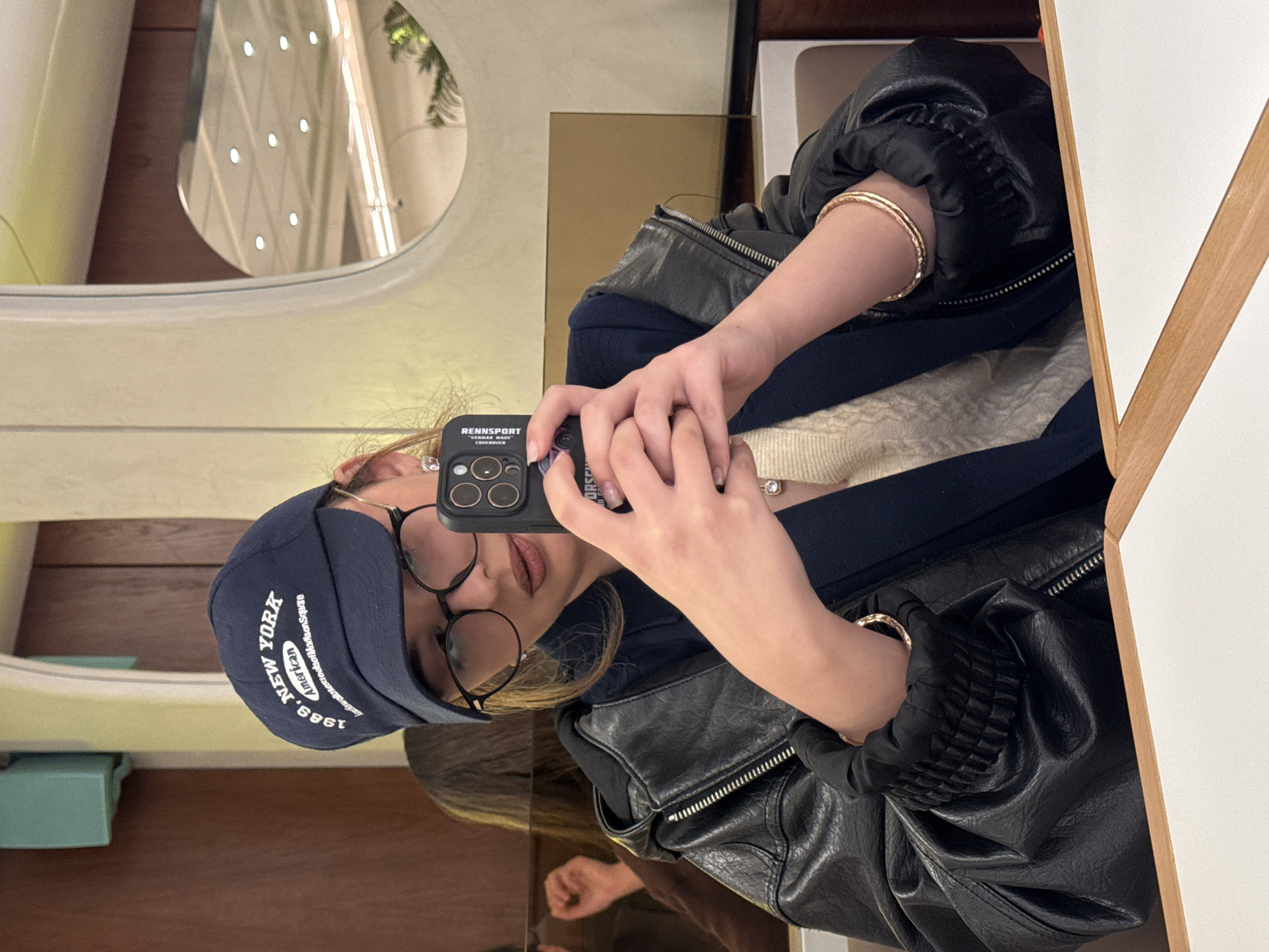 A woman is taking a selfie in front of a reflective surface with round lights. She is wearing a blue baseball cap with white text, glasses, and a black leather jacket over a dark top. The phone case has the word "RENNS PORT" on it. She is wearing two gold bracelets, one on each wrist. The scene features a reflective wall with a round mirror-like shape reflecting lights and possibly greenery. The bottom of the image shows a wood-like surface and light blue items. There's also a section of a white wall with a wooden frame. The photo does not include any details that indicate the city of Yerevan, Armenia.
