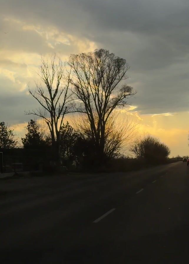 The view from a car driving down an asphalt road reveals a landscape with bare trees silhouetted against a dramatic sky