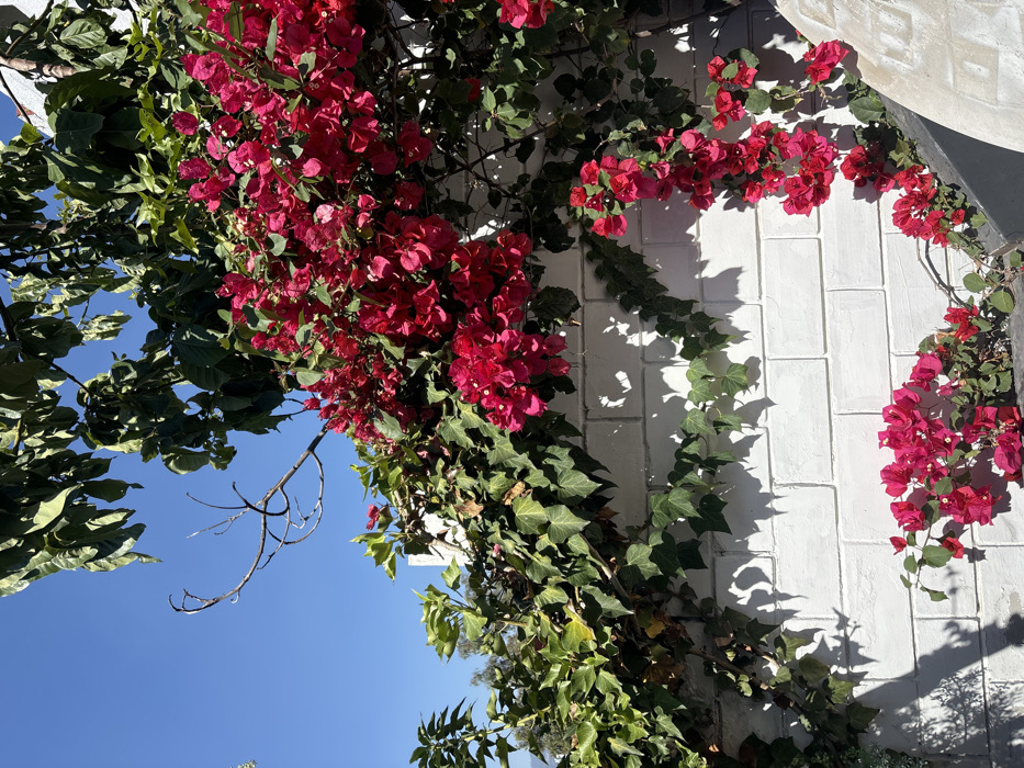 - "Red bougainvillea blossoms and green ivy cascade down a white, textured wall under a bright blue sky" by FM-rJJmw2, licensed under CC BY 4.0