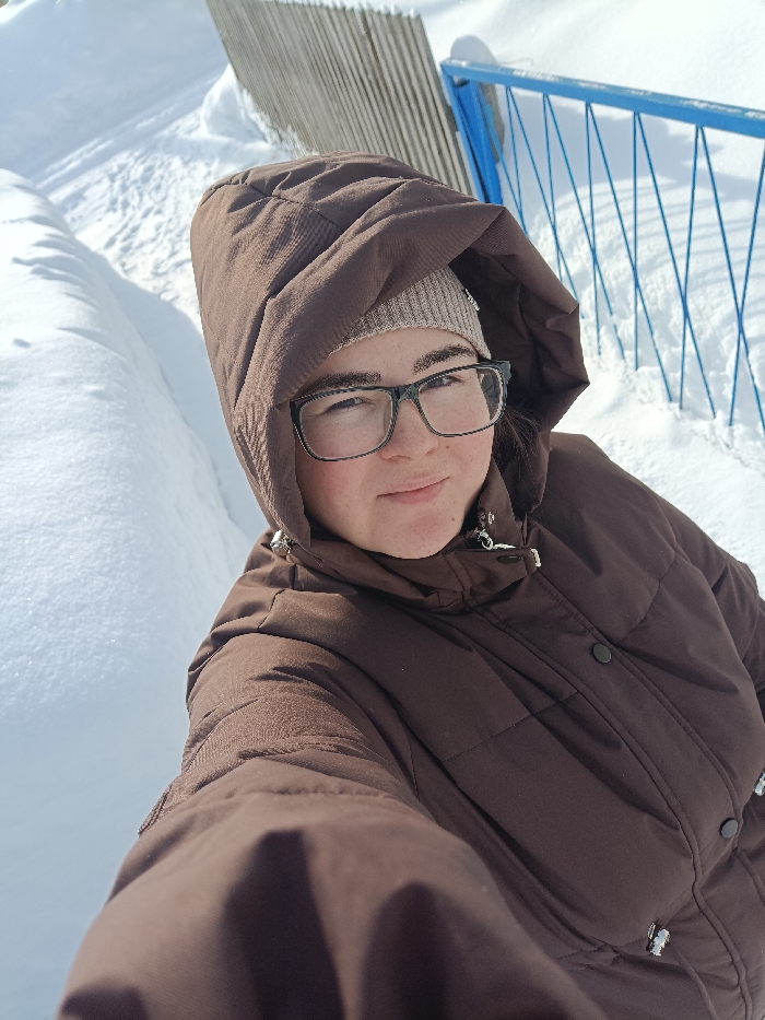 A female individual is depicted in a close-up selfie, captured outdoors in a snowy environment within the city of Posad, Russia