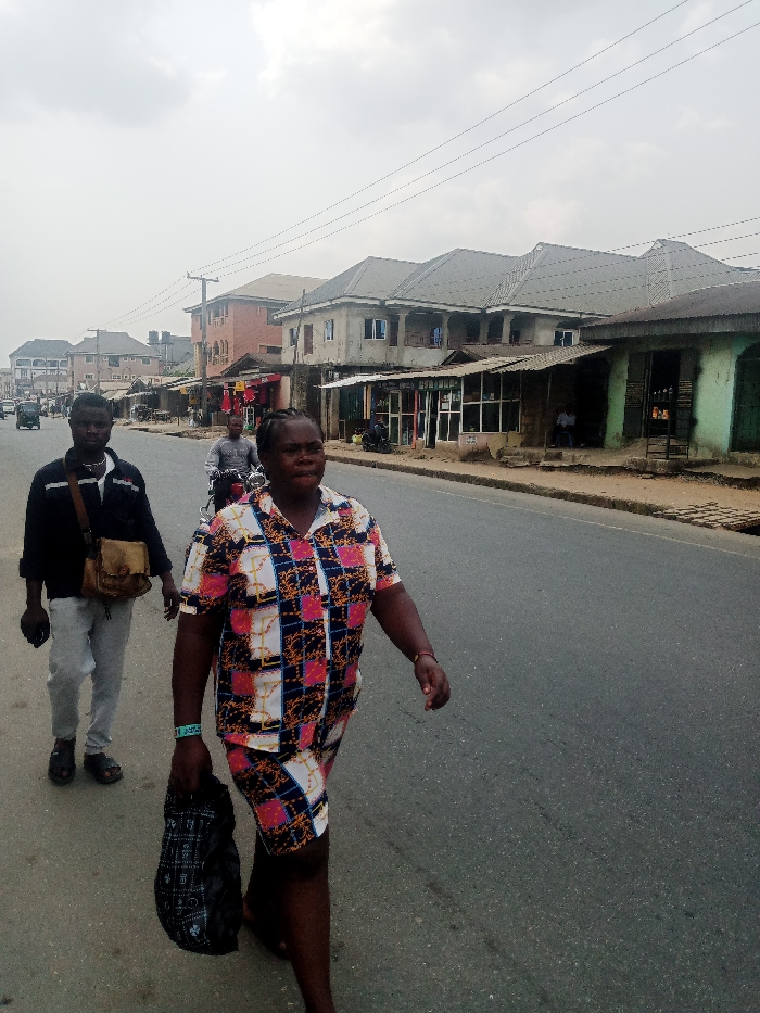 The image depicts a street scene in Umuode, Nigeria, under an overcast sky