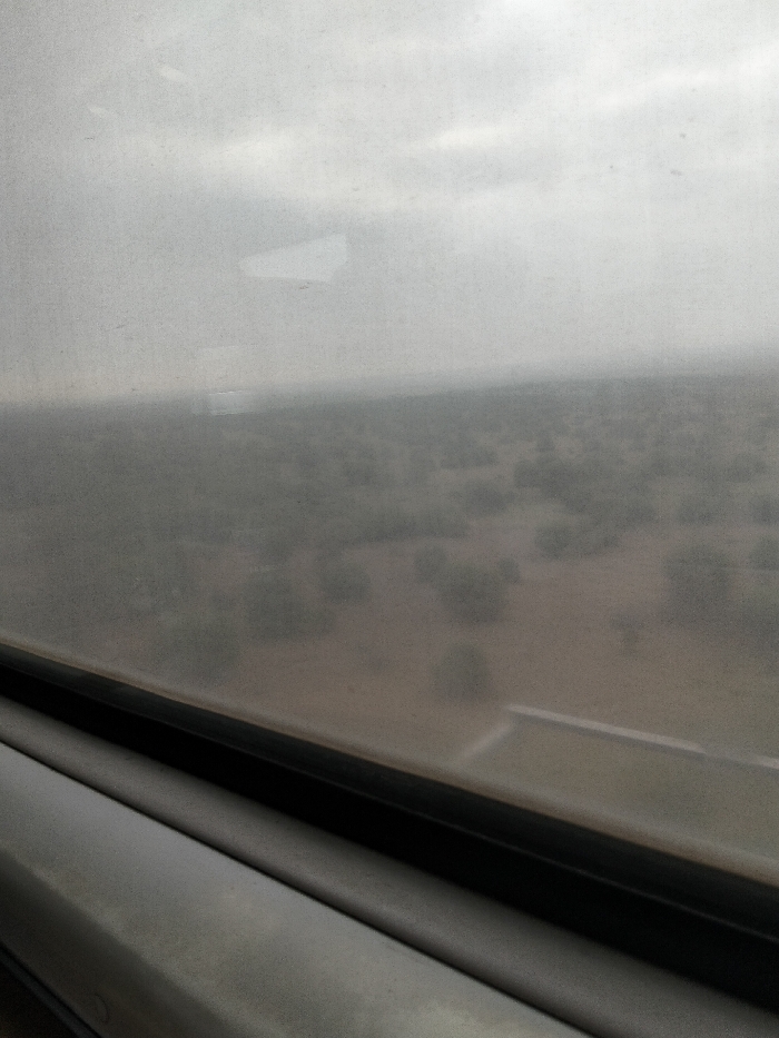 landscape viewed through a dirty window. The scene outside is hazy and indistinct, with sparse vegetation scattered across a flat, sandy terrain. Overcast skies contribute to the muted and gray color palette. The window frame is visible in the foreground, adding a sense of enclosure.
