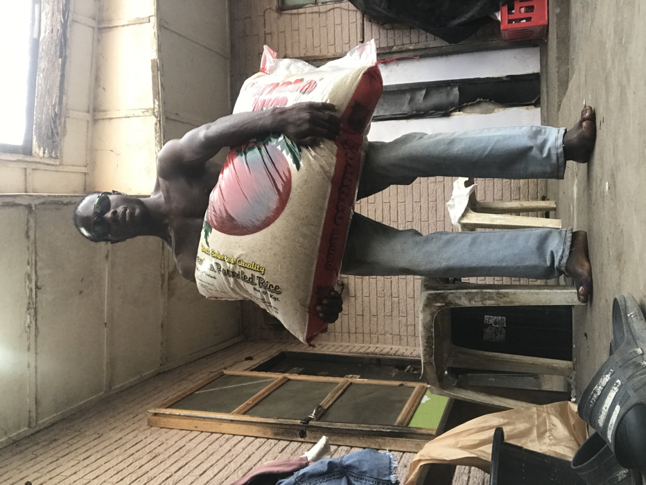 A dark-skinned man with sunglasses carries a large bag of rice over his shoulder. He wears jeans and is shirtless. The setting appears to be a cluttered room, possibly a storage area or back room of a business. The room contains furniture, windows, and assorted items scattered on the floor. The man is facing the camera, with the bag of rice obscuring part of his torso.