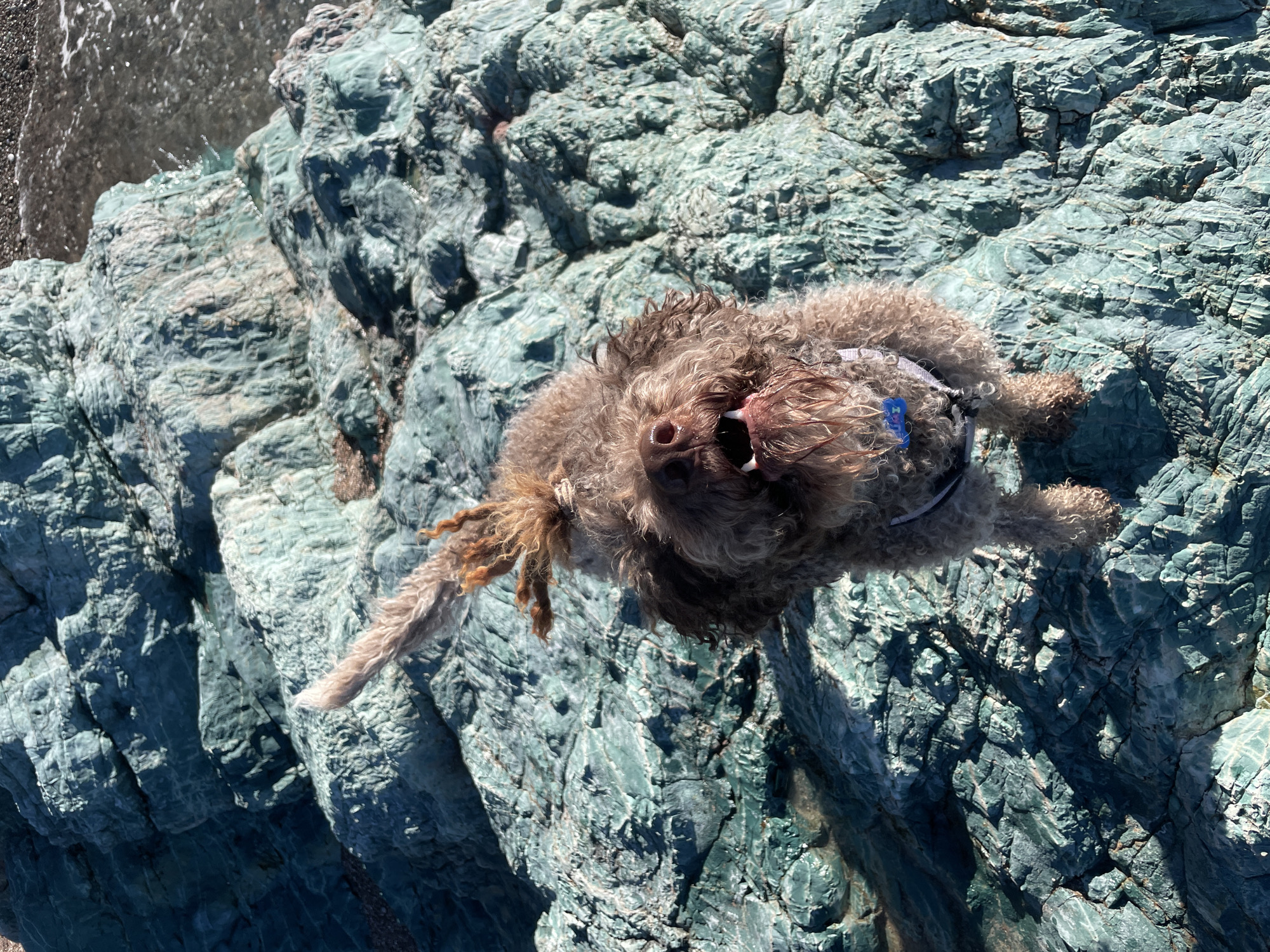 An overhead shot depicts a brown Lagotto Romagnolo dog, wearing a gray harness with a blue tag, lying on textured, blue-green rocks. The dog has its mouth open, possibly panting or barking. Part of a shoreline with dark sand or pebbles and water is visible in the upper left corner. The setting appears to be outdoors on rocky terrain near the coast in Rafailovići, Montenegro.