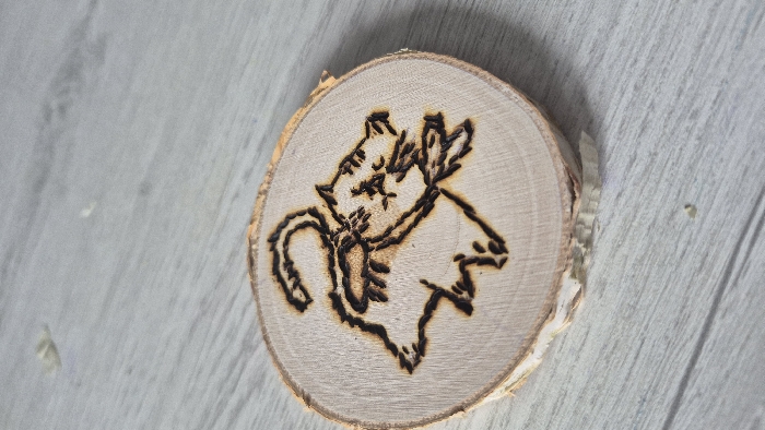 A circular wooden disc, approximately 8 cm in diameter, is centrally positioned on a light grey, horizontally-grained surface, likely a laminate floor or table. The disc is a natural wood slice, exhibiting light wood tones and a prominent wood grain, with irregular rough bark edges partially intact around its circumference. A pyrographic (wood-burned) design in dark brown depicts a stylized animal, resembling a feline or mythical creature, featuring a prominent curled tail extending upwards and backward from its body, an elongated head with distinct facial lines, and abstract body markings. The object is illuminated by ambient light, creating soft, diffuse shadows. No individuals are present, and no actions or interactions are occurring. The scene is located in Chaikovsky, Russia.