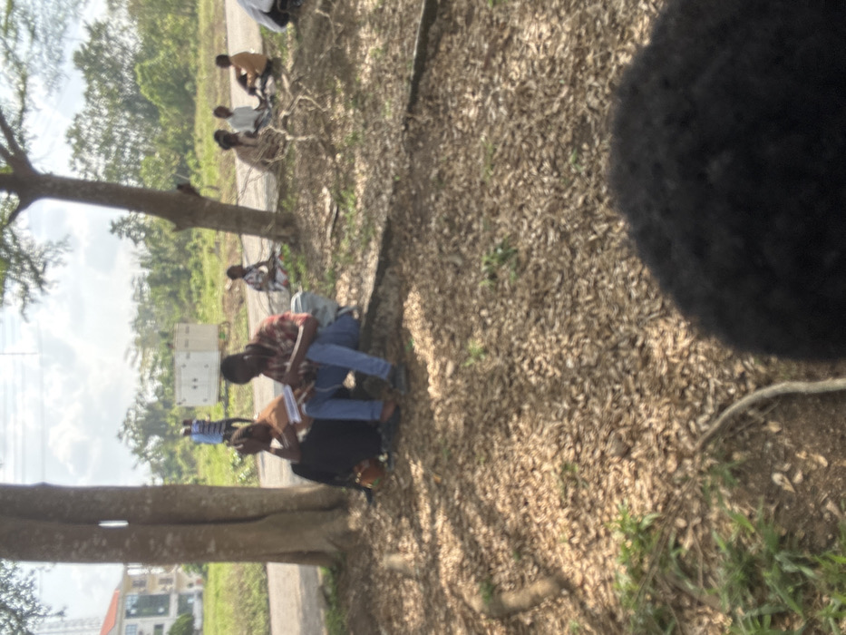 The image depicts an outdoor scene in Osu, Nigeria, during daylight. The foreground is dominated by a blurry dark mass, likely the top of a head, with a ground surface covered densely in dried, light brown leaves and sparse green vegetation visible. In the midground, two dark-skinned individuals are seated on the ground at the base of a large tree with light-colored bark. The person on the left wears a light brown top and a dark-colored skirt or dress, holding a white book or tablet, and looking downwards. The person on the right, a male, wears a red and white plaid shirt, blue jeans, and dark shoes, also holding a white book or tablet and looking downwards. He appears to have wired earbuds inserted. A light-colored backpack is positioned on the ground beside him. Behind these two individuals, a paved road runs horizontally. Further into the midground and background, several other dark-skinned individuals are observed. A group of approximately three to four people are seated on the ground to the right of the paved road, partially under another tree. Another individual is seated further to the right. To the far left background, a multi-story building with a light-colored facade is partially visible through trees. In the central background, a large white rectangular container or industrial unit is situated in a grassy area, with dense green foliage and trees beyond it. The sky above is bright with scattered clouds. The individuals are generally passive, observing personal items or resting, with no clear direct interactions visible between the main subjects.
