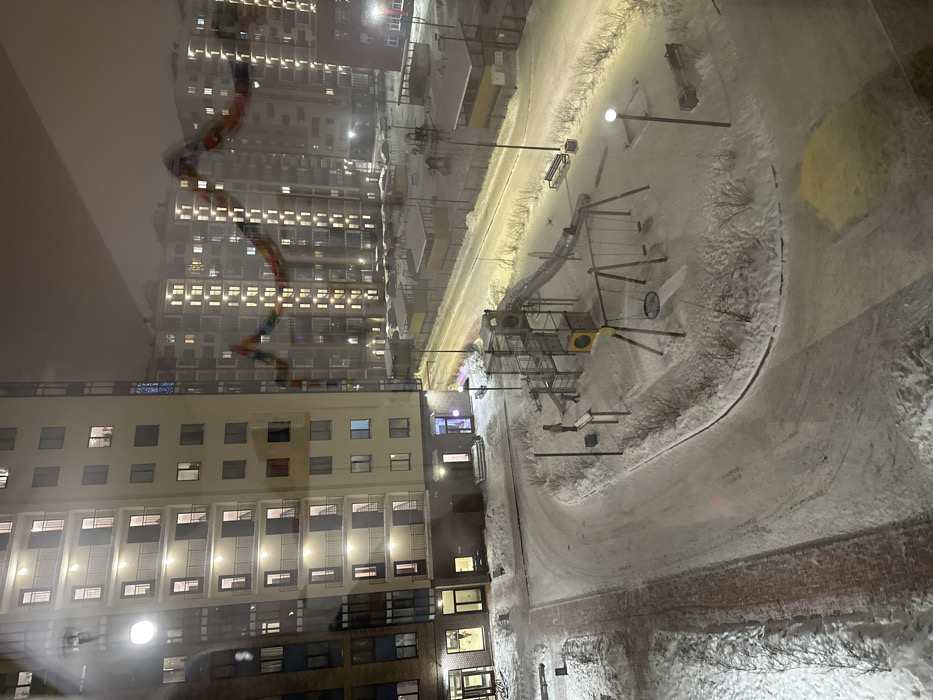 The photograph depicts a snow-covered urban landscape. A playground sits in the foreground, visible through a window's reflection of a nearby apartment building with lit windows. Streetlights illuminate the snow-covered path winding through the playground, highlighting the contrast between the white landscape and the artificial light. The window reflection overlays a partial view of a towering structure.