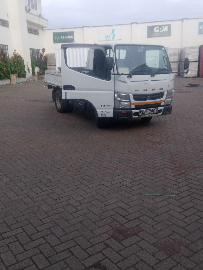 A white FUSO truck is parked on a paved brick surface. The truck faces right with the license plate "KDH 290Y" visible. Behind the truck are buildings, including one with the signs "Realtec", "SSK", and "GDM". Greenery is present near one of the buildings. The sky is overcast, suggesting a cloudy day.