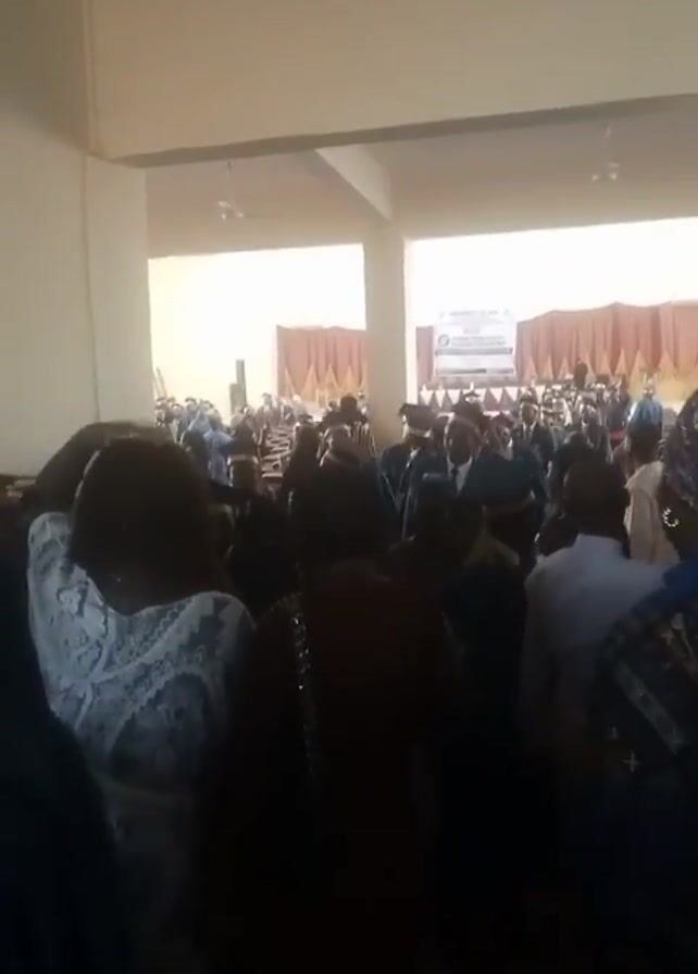 room full of people, many wearing graduation gowns and caps. It appears to be a graduation ceremony or celebration. The camera moves through the crowd, offering glimpses of individuals in their graduation attire. The room has a high ceiling with lights and a stage with a curtained backdrop. The lighting in the room is bright.