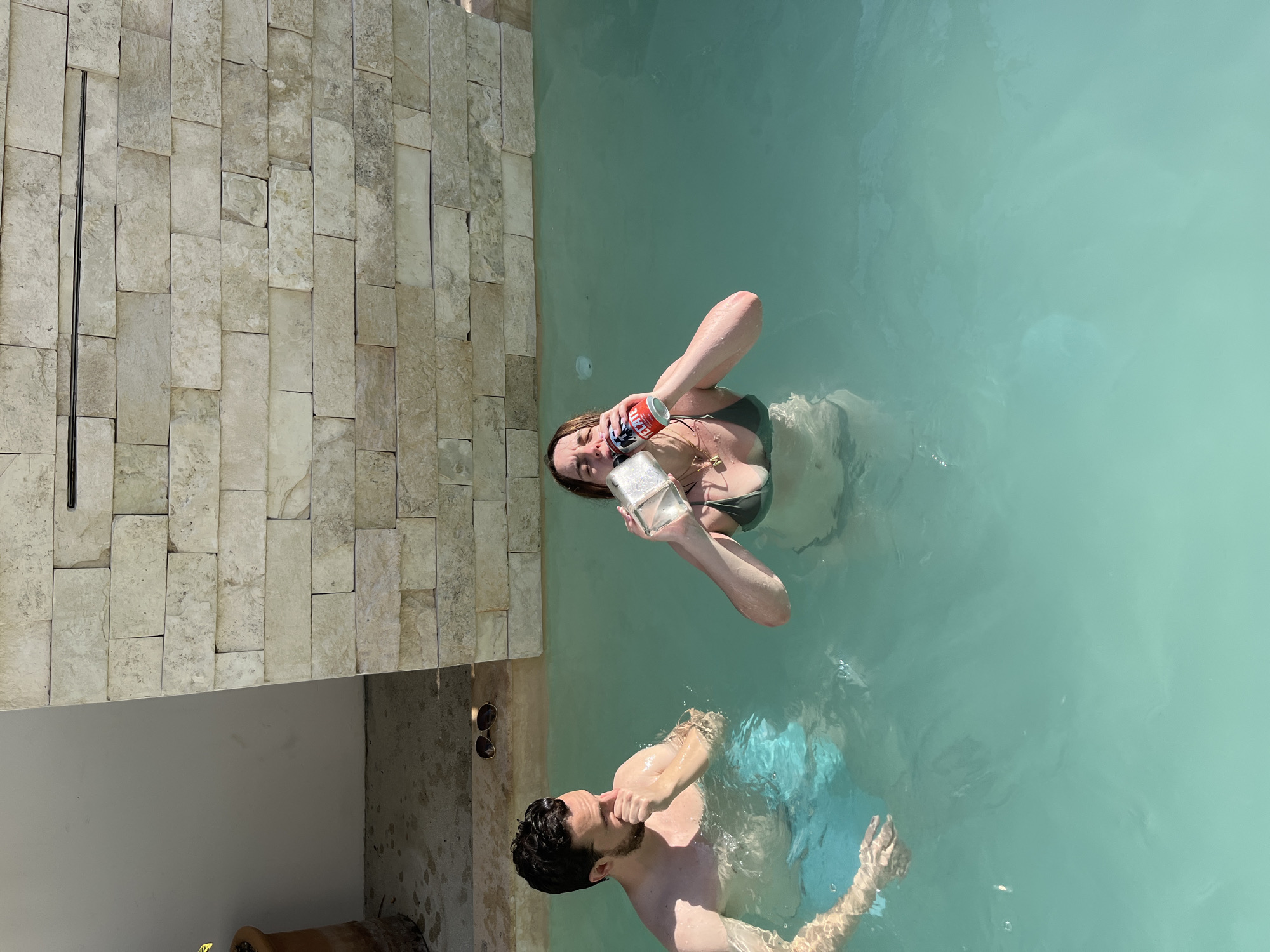 A woman and a man are in a body of water next to a wall. The woman is holding a can and a clear, rectangular object, possibly a bottle. The man is facing towards the wall. On the wall, a pair of sunglasses are on the ground. The location is likely Brisas de Zicatela, Mexico.