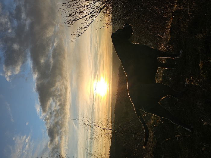 A dog stands in silhouette against a vibrant sunset. The sky transitions from blue with fluffy clouds to a yellow-orange gradient meeting the horizon. Bare tree branches frame the top and bottom of the view. The dog is positioned to the right, its form dark against the bright light, its tail curved slightly. Vegetation surrounds the dog.