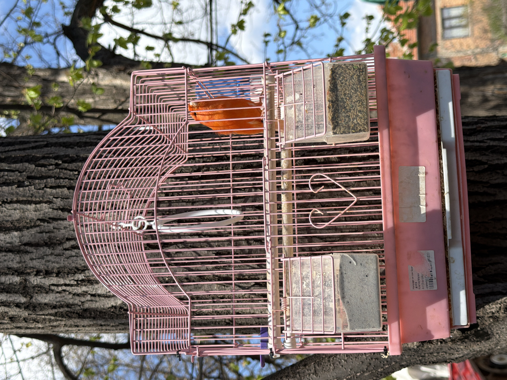 A pink birdcage rests precariously on a thick tree branch. Within the cage are objects that appear to be bird food and accessories. A tag with Cyrillic text is visible on the side of the cage, indicating that this photograph was likely taken in a country that uses the Cyrillic alphabet. The tree branch is textured with deep furrows, and the leaves of the tree extend outwards. The sky is visible through the branches of the tree. A blurred building can be seen in the background. Given the request, the location is assumed to be Tsalapitsa, Bulgaria.