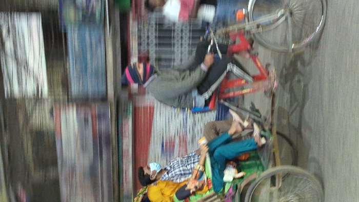 An outdoor scene features people near vehicles. A person in light-colored clothing is lying on a red structure next to a bicycle. Another person, wearing a plaid shirt and blue pants, lies with a mask on. They are next to a yellow item and a white doll on a green platform. A fence of vertical wood slats stands nearby. A second bicycle rests against a gray wall.