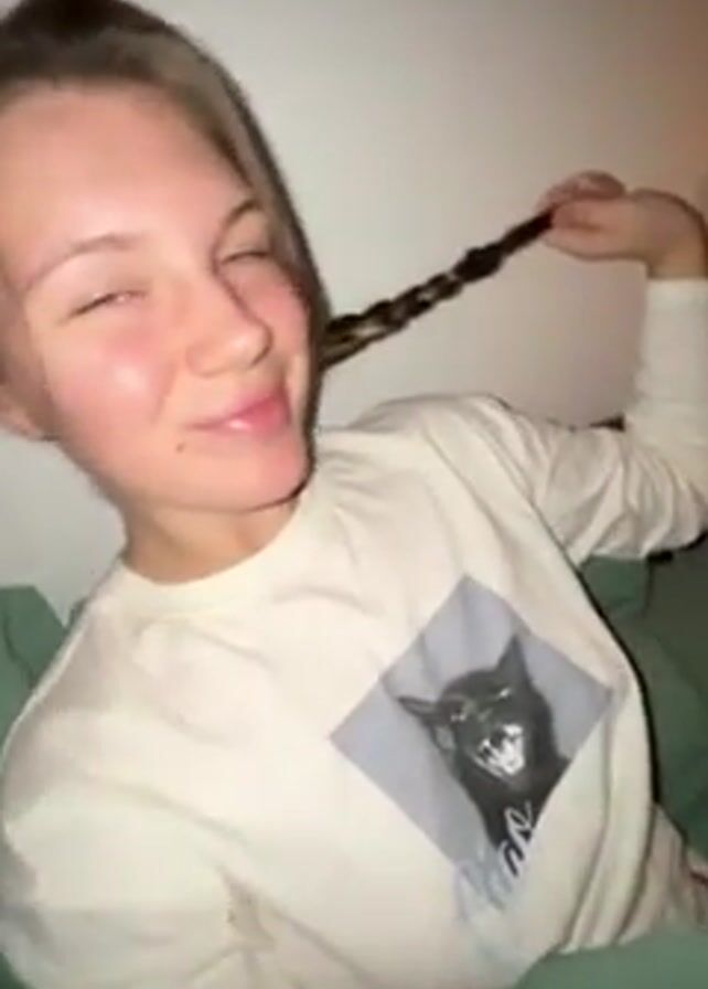 A young woman with fair skin and light brown hair styled in braids is sitting on a green couch. She is wearing a long-sleeved white shirt with a graphic of a black cat on it. She is holding one of her braids and playfully pulls at it, making a slight grimace. The background is a plain white wall. The lighting is soft and warm.