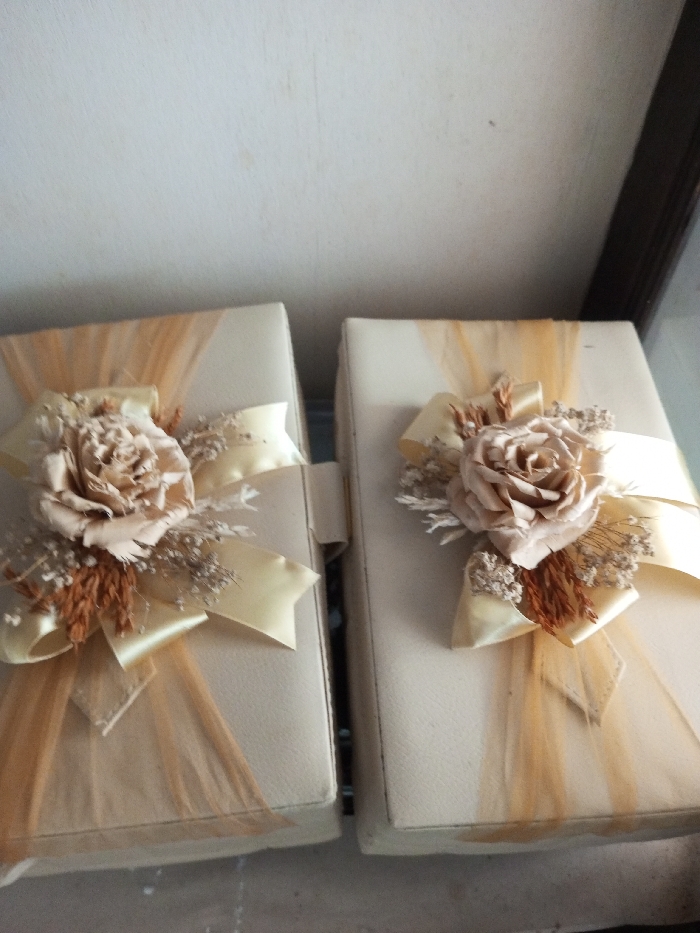 The image presents two identical rectangular decorative boxes, positioned side-by-side on a light-colored, indistinct surface. Both boxes are a uniform light beige or cream color. Each box is elaborately adorned with a light gold satin ribbon tied into a bow, centrally placed on the lid. Perched atop each bow is a large, artificial fabric rose in a light beige or dusty rose hue. Surrounding the roses and bows are clusters of dried, small white flora (resembling baby's breath) and wisps of dried brown-orange grasses or grains. Sheer, translucent light orange fabric or tulle is draped beneath the ribbon arrangements, extending over the tops and partially down the sides of the boxes. The background consists of a plain, off-white wall exhibiting minor smudges or discoloration. A dark brown vertical element, likely a furniture edge or doorframe, is visible along the far right edge of the frame. No individuals are present, and no actions or interactions are occurring. This scene is located in Qarabucaq qəsəbə, Azerbaijan.
