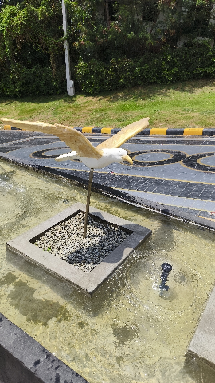 An outdoor scene in an unknown city, at an unknown location, features a decorative fountain area. A statue of a white seagull with light brown wings and beak stands prominently on a thin brown pole. This pole is anchored in a square concrete planter filled with light-colored gravel, positioned within a shallow, light yellowish-green body of water. To the right of the statue, a black fountain nozzle actively produces bubbling water. Behind the fountain, a paved area displays a pattern of black tiles with alternating gray and yellow stripes, incorporating circular motifs. A black and yellow striped curb borders this paved section. Further back, a grassy slope rises towards a dense treeline of green foliage, with a light-colored utility pole partially visible on the left side of the frame. The scene is brightly illuminated by direct sunlight. No individuals are present.