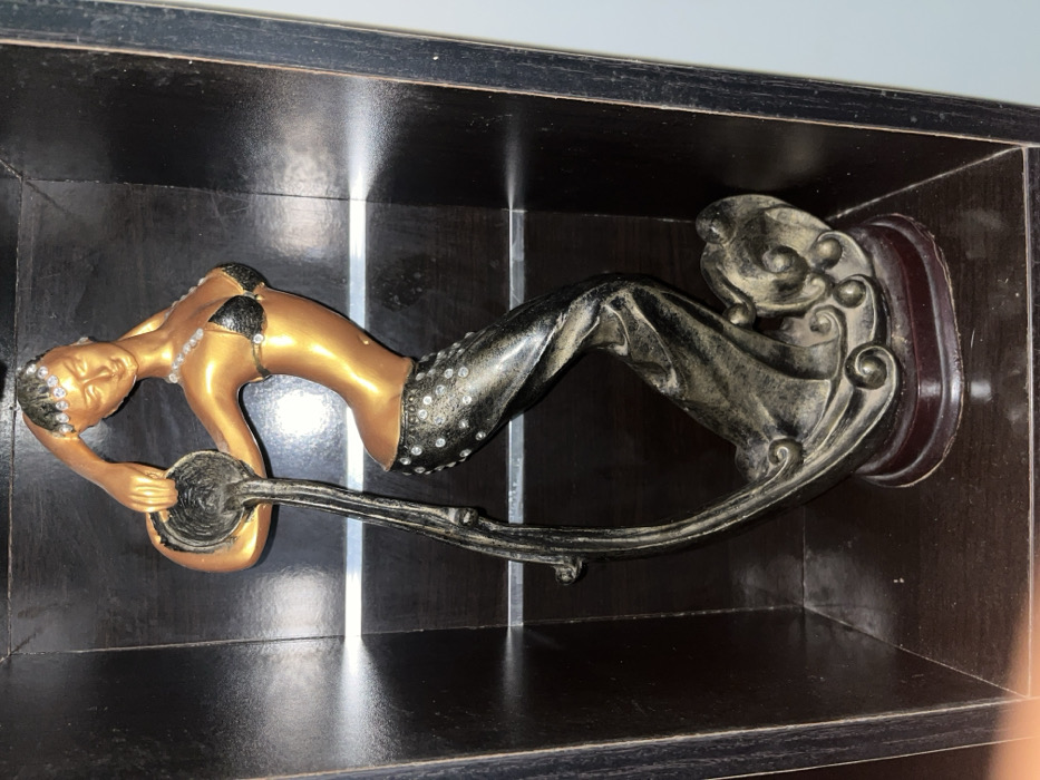 A decorative statue of a stylized female figure stands centrally on a shelf within a dark brown, multi-compartment wooden shelving unit in an interior setting