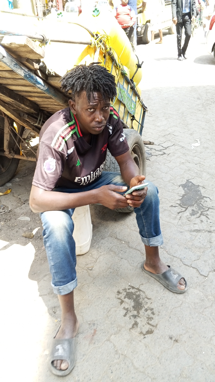 This image depicts an urban street scene in Nairobi, Kenya. A young male individual, with dark skin and short dreadlocks, is seated on a white plastic bucket on a cracked, light-grey paved surface. He wears a dark, short-sleeved shirt with red and green stripes on the shoulders, featuring white lettering including 'Emirates Fly Better', blue denim jeans cuffed at the ankles, and dark grey open-toe slides. He holds a light-colored smartphone horizontally with both hands, looking directly towards the camera. Behind the individual, a wooden cart structure, partially painted blue, is visible. Large, yellow, irregularly shaped bundles or containers are loaded onto this cart and secured with ropes. A black tire is visible adjacent to the cart. In the background, to the right, a person in a dark suit jacket and trousers is walking away from the camera. Other indistinct figures and vehicles are present further in the background, indicating a busy public thoroughfare or market area. The ground also exhibits several dark stains and what appears to be a discarded banana peel on the far left.