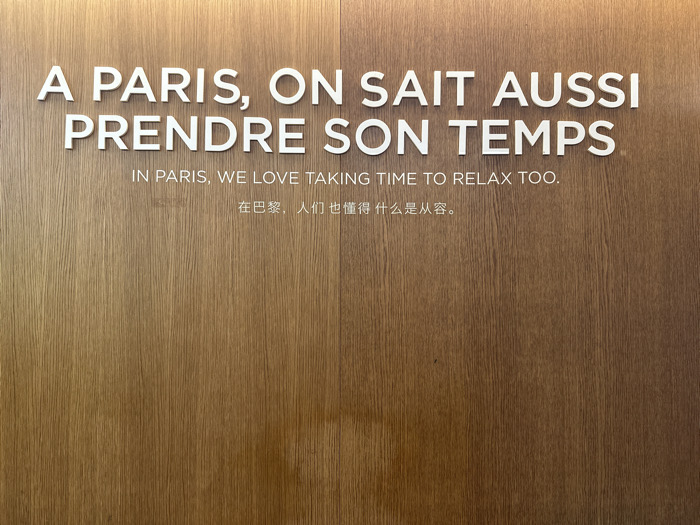 A light brown wooden wall, composed of two vertical panels with visible grain, displays three lines of white text. The top line features large, embossed French text: "A PARIS, ON SAIT AUSSI PRENDRE SON TEMPS." Below this, smaller, flat English text reads: "IN PARIS, WE LOVE TAKING TIME TO RELAX TOO." The third line, in equally sized flat Chinese characters, states: "在巴黎,人们也懂得什么是从容。" The wooden surface reflects ambient light, appearing slightly brighter at the top. The image depicts a static informational or decorative sign, likely located within a public facility such as an airport terminal or hotel in Le Mesnil-Amelot, France, a commune adjacent to Charles de Gaulle Airport (CDG). No individuals or actions are visible.