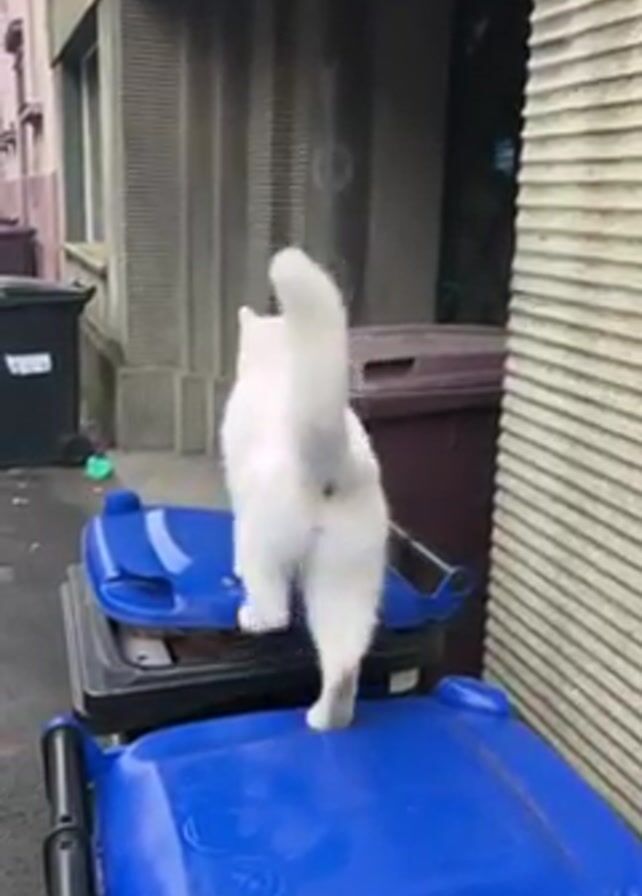 white cat from the back standing on the lid of a blue recycling bin, atop another recycling bin