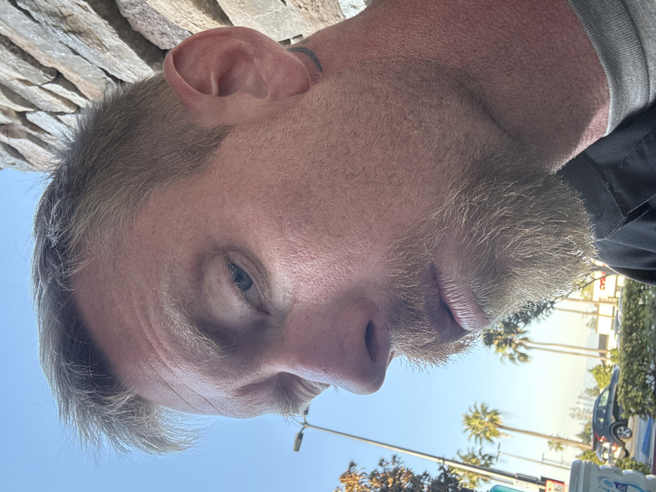 A man’s face is viewed from below, capturing his left profile against a bright sky with palm trees in the background. His short, light-colored hair contrasts with the stubbled beard. Details like the veins visible on his temple, and the subtle lines around his eye, are highlighted. A brick wall is partially visible in the top left.
