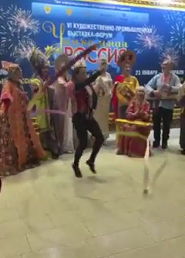 The video captures a performance in front of a backdrop promoting the "VI ART AND INDUSTRIAL EXHIBITION-FORUM, UNIQUE RUSSIA," with the date "23 JANUARY" visible