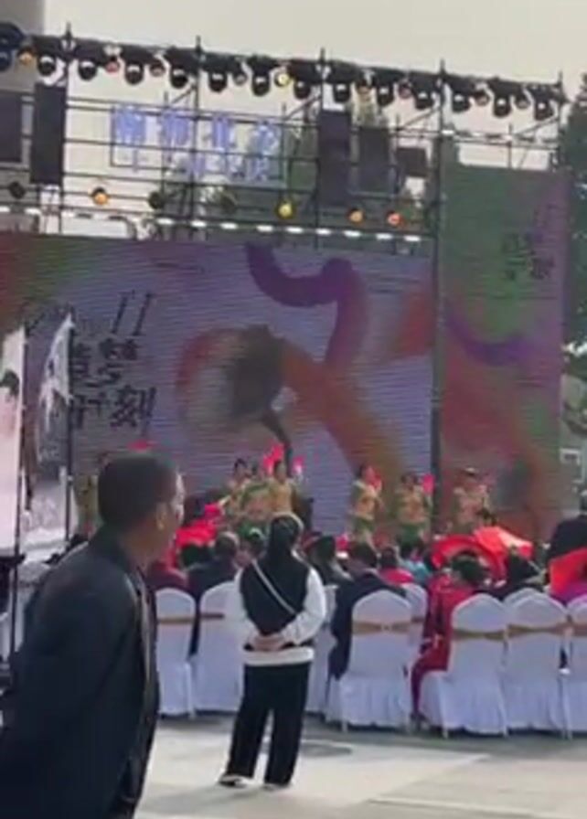 n outdoor performance taking place on a stage in a public square. A group of dancers in green and orange costumes with red and green fans are performing on stage in front of a crowd of seated attendees. A large screen behind the performers shows colorful graphics and Chinese writing. A woman wearing a black outfit is standing facing the performance. The sky is overcast, and there are buildings in the background. Several light fixtures hang above the stage.
