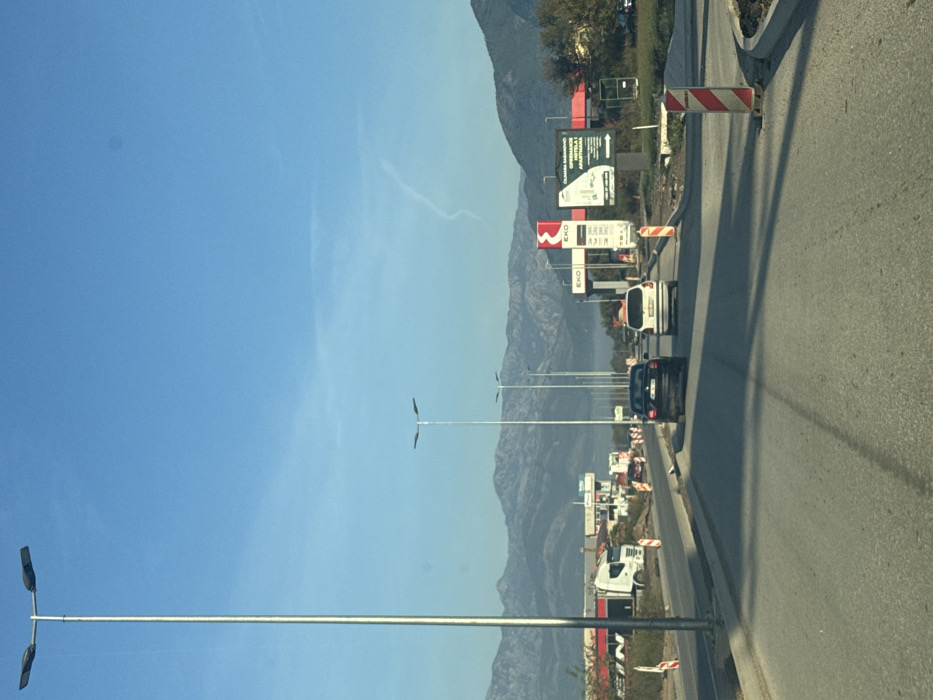 A roadside view reveals a straight asphalt road adjacent to a mountainous backdrop under a clear blue sky. Several street lights line the road's edge. A gas station and various traffic signs are visible. Vehicles travel along the road, indicating active traffic. Construction or roadwork elements, marked by striped barriers, are present on the roadside.