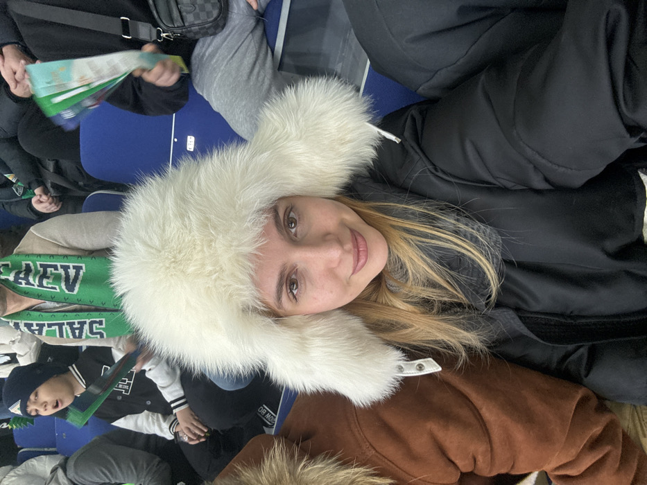 An indoor arena scene depicts spectators seated in blue stadium seats, likely at the Ufa Arena in Ufa, Russia, during a Salavat Yulaev ice hockey event. The foreground is occupied by a young adult female with light skin and blonde hair, wearing a white fur Ushanka-style hat and a black winter jacket, smiling directly at the camera. To her immediate left, the back and a fur-lined hood of a person wearing a brown jacket are visible. Behind the primary subject, a young male child, estimated 8-12 years old, wears a dark blue beanie and a white and black letterman-style jacket. He is seated with an open mouth, appearing to shout, and holds a green folded item. To his right, an adult male wears a beige top and a green knit scarf displaying "SALAVAT YULAEV" in white text. Further right, another spectator's legs, clad in grey tracksuit bottoms, and a black checkered shoulder bag are visible as they hold a green folded item. Other blurred spectators in winter attire are present in the background.