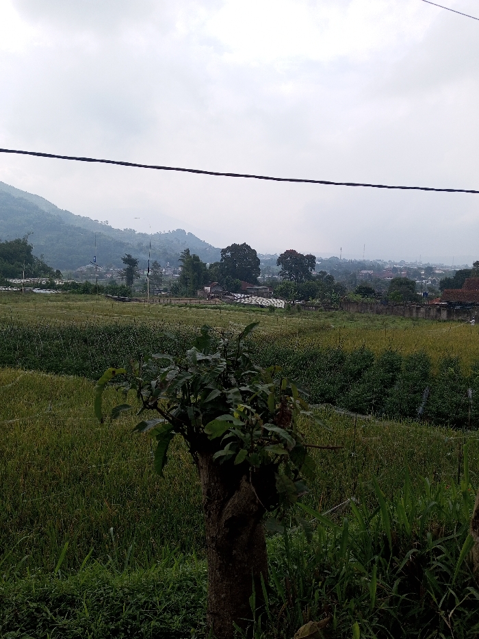 The image displays a rural landscape transitioning into an urban setting in Sandamal Eliya, Sri Lanka, under a heavily overcast sky. A dark overhead cable stretches horizontally across the upper portion of the frame. In the immediate foreground, a robust, partially pruned tree trunk with green foliage is prominently situated on the right, surrounded by tall green grasses and other dense vegetation. The midground consists of extensive cultivated fields, primarily lush green crops consistent with rice paddies, intersected by a dirt path and containing scattered small white flags or markers. Further into the midground, a grey concrete wall delineates the agricultural land from a residential area featuring buildings with reddish-brown tiled roofs. The background reveals a densely built-up town extending towards a range of green, tree-covered mountains, partially obscured by atmospheric haze. No individuals, specific actions, or interactions are observable.