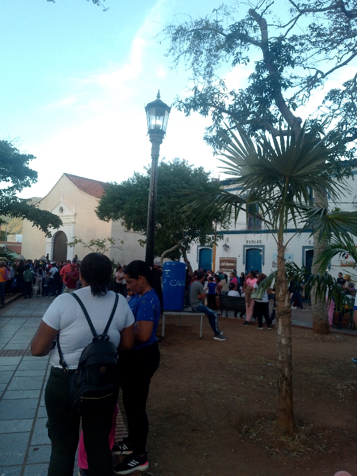 The image displays an active public square, identified as Plaza Bolívar in La Asunción, Venezuela, during late afternoon or early evening