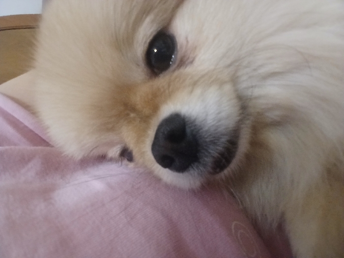 A fluffy, light-tan Pomeranian dog rests its head on a pink surface. The dog's black nose and dark eyes dominate the frame, with its soft fur blending into a lighter background. Its gaze is slightly off-camera, giving a relaxed, almost sleepy expression. The focus is tight, highlighting the dog's face and fluffy coat.