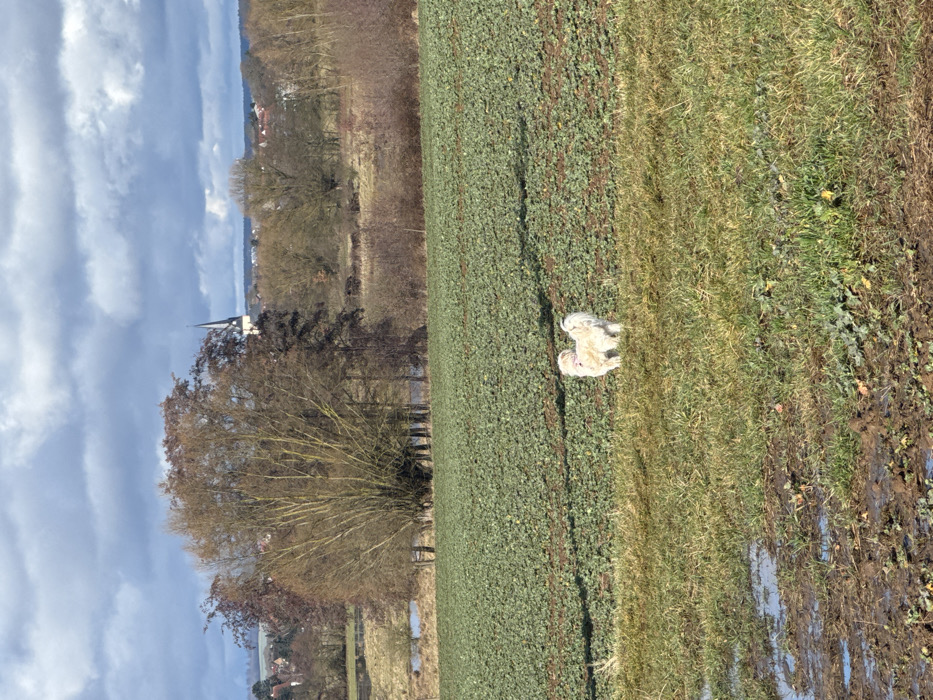 - "A small, light-colored, fluffy dog with a pink collar stands on a strip of green grass and mud in a rural landscape" by FM-EWyxv2, licensed under CC BY 4.0