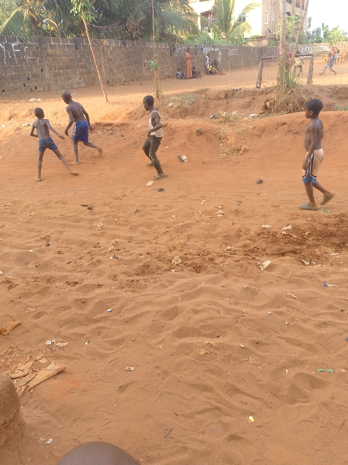 Four young boys play soccer on a sandy, reddish-brown field. Behind them is a low, brick wall with graffiti and spectators. A makeshift goal is constructed of sticks and netting. The background shows simple buildings with trees and greenery. The ground is littered with scattered debris. The lighting suggests a sunny, outdoor setting.