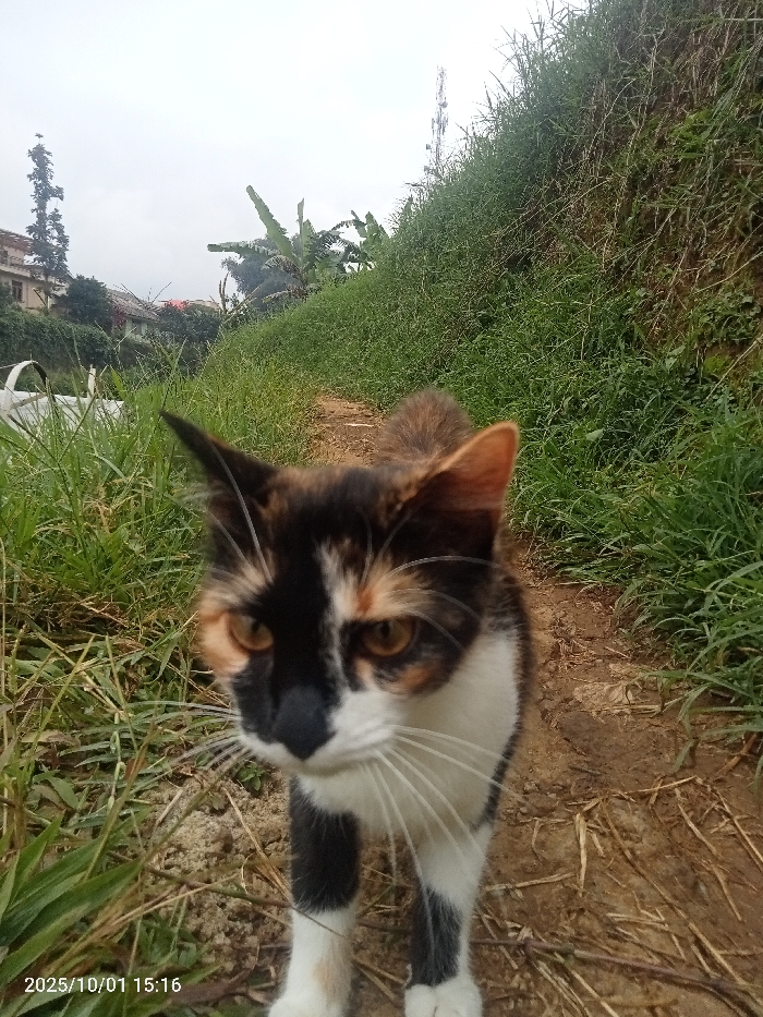 A calico domestic shorthair cat is depicted in a medium shot, centered on an unpaved dirt path in Athiru Ruujine ward, Kenya. The cat features a coat pattern of black, white, and orange/tan patches, with distinct amber eyes, a black nose, and prominent white whiskers. It stands on all four paws, directly facing the camera with an alert expression. The narrow dirt path is flanked by dense green grass. A steep, heavily vegetated embankment rises on the right side of the path. To the left, further in the background, residential buildings are partially visible through foliage, including banana trees. A cellular tower is discernible above the right embankment. A white object, possibly a container, is partially visible in the grass on the left foreground. The sky is overcast. The image bears a timestamp of "2025/10/01 15:16" in the lower-left corner.