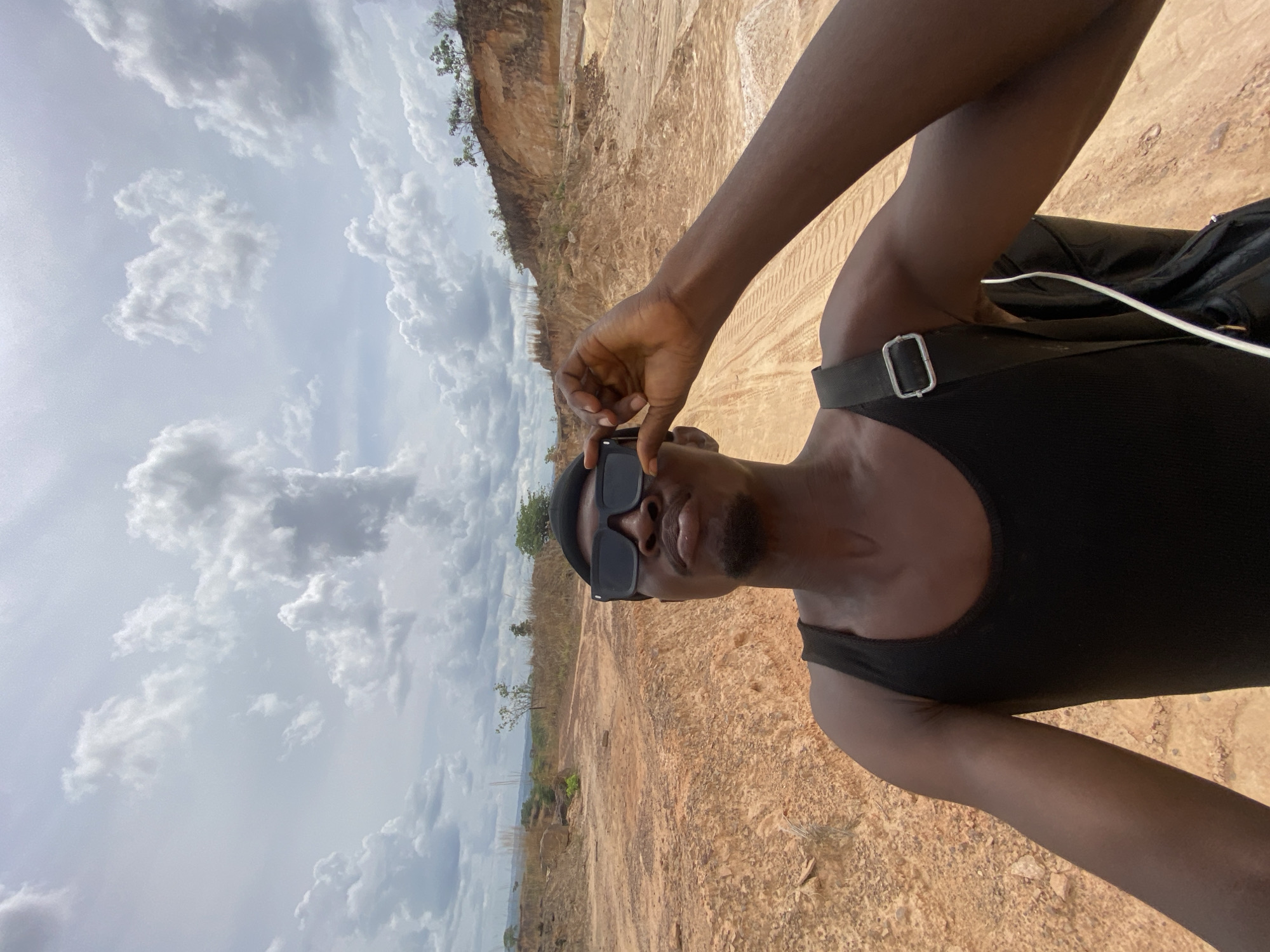 An upward-angled photograph captures a dark-skinned male subject, seen from the chest up, positioned in an open, excavated landscape in Achara, Nigeria. The subject wears a black ribbed tank top, black rectangular sunglasses, and a dark cap, with a short goatee visible. His left hand is raised, gripping the right temple arm of his sunglasses as if adjusting them. A black shoulder bag with a silver buckle is visible over his right shoulder, with a white cord protruding from it. The background consists of extensive reddish-brown, sandy soil displaying visible vehicle tracks. Eroded earth mounds and hills, sparsely vegetated with dry grass and small trees, are present in the mid-ground and background. The sky above is partly cloudy, filled with numerous white and grey cumulus clouds.
