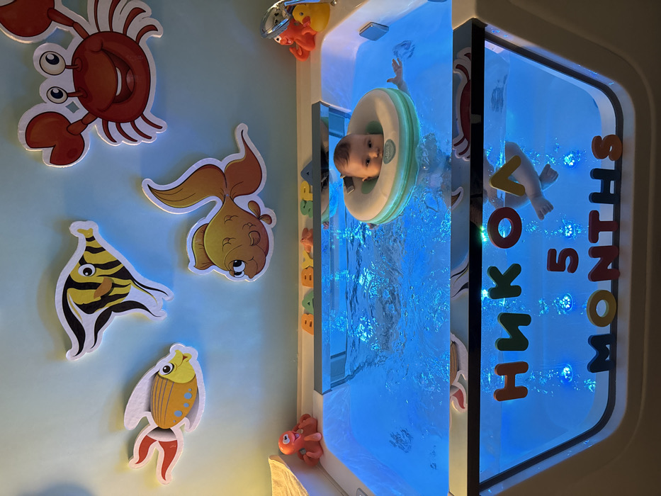 The image depicts an indoor facility, specifically a baby spa environment, likely situated in Pleven, Bulgaria