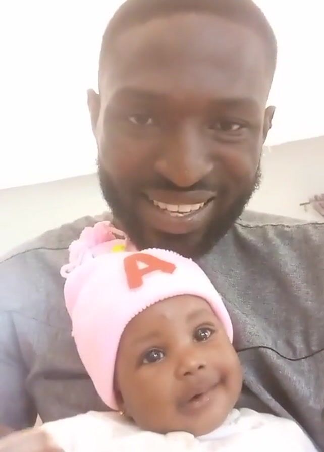 A man with dark skin and a beard is holding a baby with dark skin. The baby is wearing a white outfit and a pink hat with an "A" on it. The man is smiling and looking at the camera, while the baby is looking at the camera with a neutral expression. The background is blurry and appears to be a room with white walls. There is music playing.
