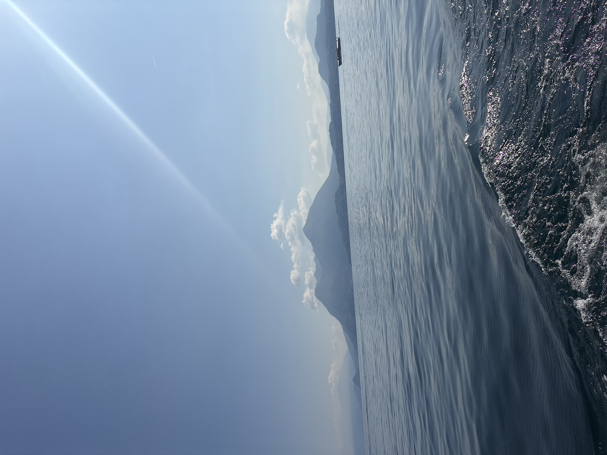 The image depicts a body of water with a mountain range in the background under a clear, bright sky. The water shows varying textures, from smooth ripples to more turbulent, frothy areas. Light glints off the surface of the water, creating a sparkling effect. In the background, a series of mountains fade into the hazy distance with scattered clouds. The sky is a clear blue, with a bright streak of light visible in the upper-left. There are no people visible in the image. Given the prompt's reference to Binda, Italy, it's plausible the image depicts a lake scene from that region, but no specific location can be determined from the image alone. A small structure may be located on the water.