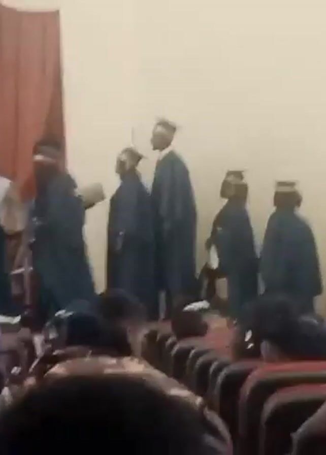 graduation ceremony inside a room with rows of red seats filled with attendees. A group of graduates dressed in blue gowns and caps are lined up against a wall. Some graduates are wearing traditional headbands. A red curtain hangs on the wall behind them. A small child peeks from behind a row of seats, looking towards the graduates. Other people are seated on a raised platform on the right. An air conditioning unit is mounted on the wall.
