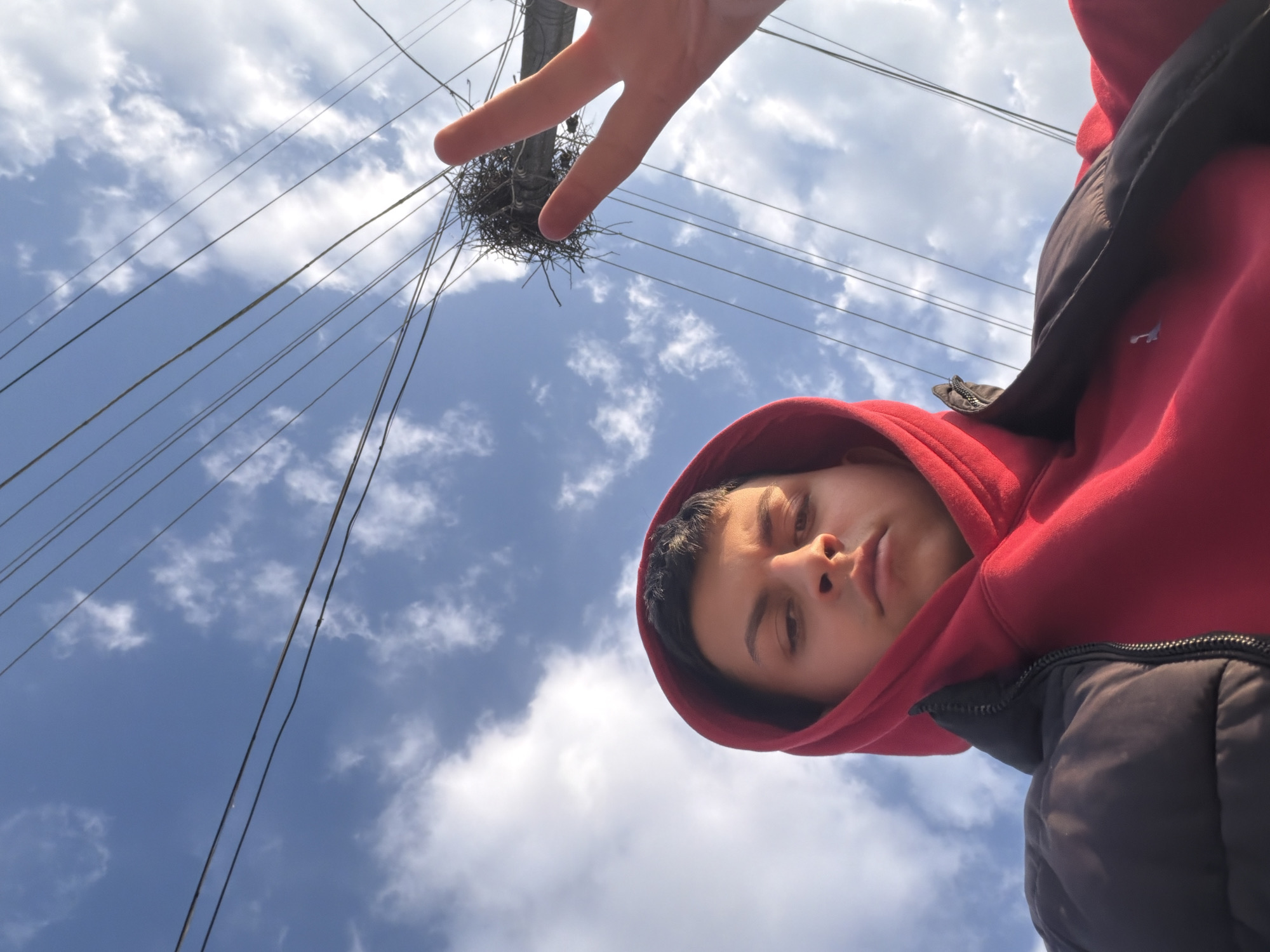 The image is taken from a low angle, looking up at a person wearing a red hoodie and a dark jacket. The person is making a "peace" sign with their hand. In the background, there is a blue sky with some clouds, power lines, and what appears to be a large bird nest perched atop a utility pole. This location is likely in Dolni Dabnik, Bulgaria.