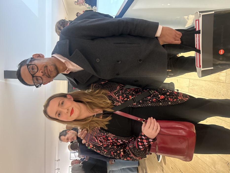A man with glasses, wearing a dark coat and light pink shirt, stands beside a woman with blonde hair. She is wearing a black dress and a patterned floral jacket with a red handbag over her shoulder. They are standing in a well-lit gallery with a crowd of people visible in the background. The man holds a black shopping bag with the Leica logo.