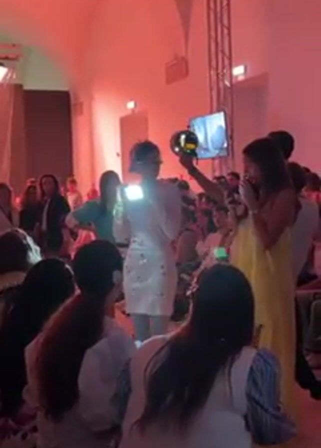The video depicts a fashion show in an indoor space with red lighting. A model wearing a short white dress and white tights walks through the seated audience. One person holds a bright, rectangular light, while another records with a camera displaying an image on its screen. Members of the audience are dressed in a variety of styles, and some are using their phones to capture the show. Above, there is a metal structure with lights attached.