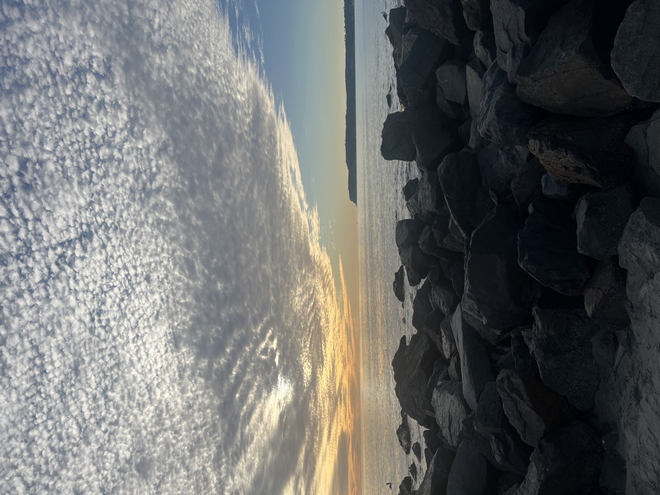 A sideways view of a body of water meeting a textured sky. A pile of dark gray rocks fills the right side of the frame. The water reflects the sunset colors, transitioning from orange to light blue. Above the water, the sky is filled with cumulus clouds, creating a rippled pattern with sunlit edges. The clouds shift to a textured, almost grainy cloud formation towards the left side.