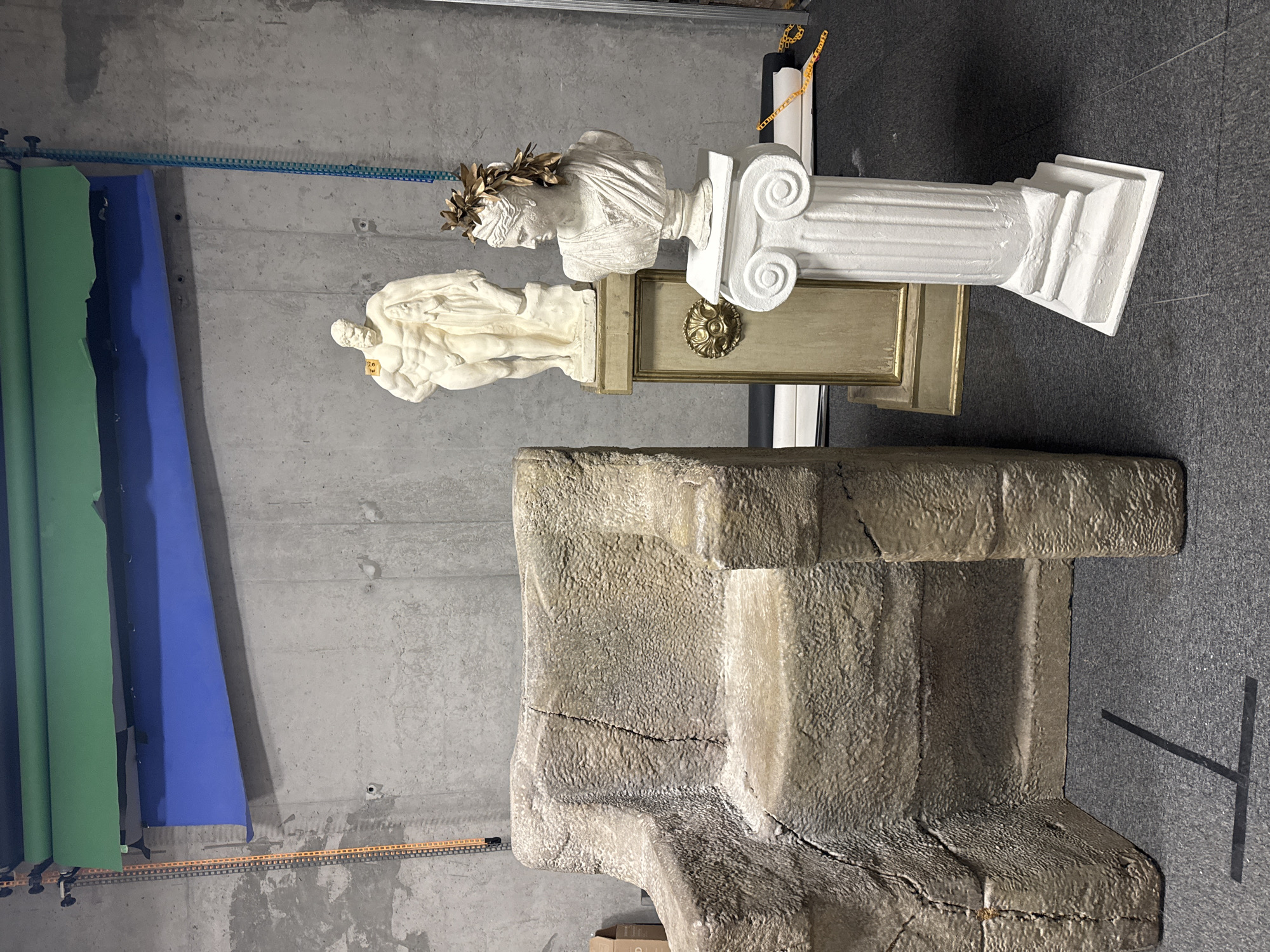 The image depicts a studio environment located within Sofia, Bulgaria, characterized by a rough concrete back wall and a dark gray carpeted floor. Mounted high on the concrete wall are three rolls of photography backdrop paper—black, green, and royal blue—managed by a roller system with visible orange and blue chains. In the foreground, a large, rectangular chair, appearing to be crafted from a lightweight material textured to mimic aged, rough-hewn stone in a light beige color, occupies the left side. A prominent vertical fissure runs down the center of its backrest. To the right of the chair and slightly deeper into the scene, a tall, decorative pedestal with gilded trim and a central gold medallion supports a white classical statue. This statue portrays a muscular male figure carrying a smaller, draped individual. A small yellow sticky note is affixed to the chest of the male figure. Adjacent to this pedestal, positioned slightly forward, stands a white, fluted column pedestal with an Ionic capital, which supports a white bust of a female figure. This bust is adorned with a golden laurel wreath on her head. A black 'T' shaped marking is present on the dark gray floor directly in front of the stone-like chair. A yellow measuring tape is visible rolled on the floor in the far right corner, and a portion of a brown cardboard box is visible on the far left edge of the frame.