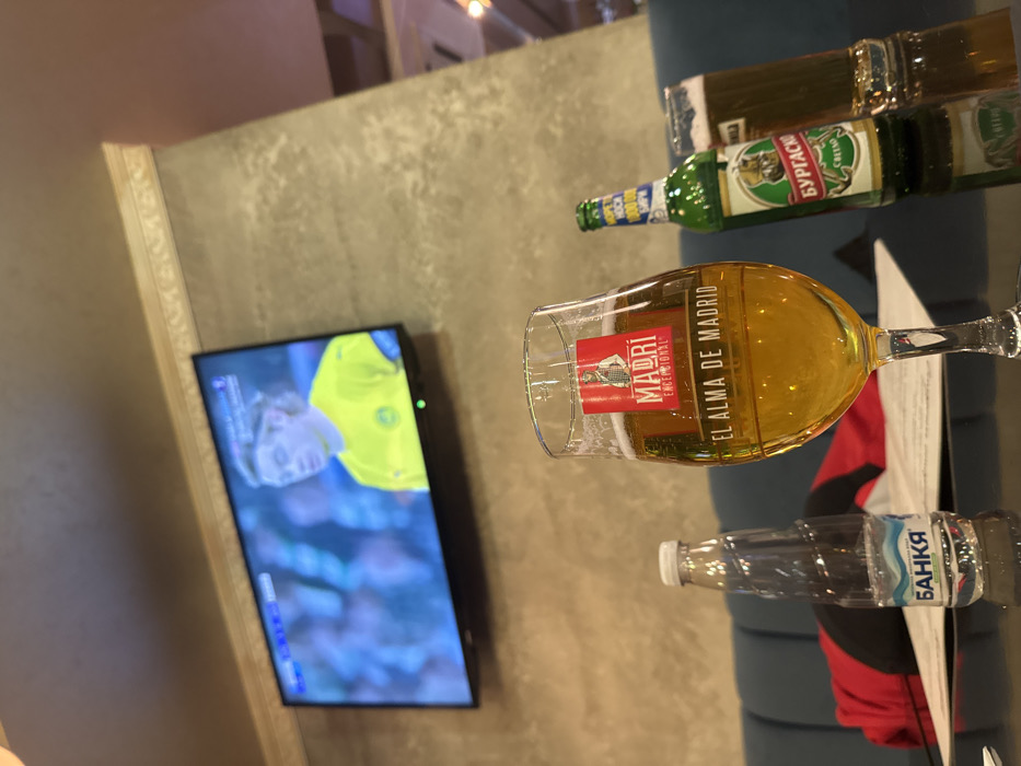 This image depicts an interior scene within a bar or restaurant located in Asenovgrad, Bulgaria. In the foreground, a dark, reflective table holds several beverage items. A prominent glass of Madrí Excepcional beer, approximately three-quarters full, stands centrally. To its left is an upright clear plastic bottle of Bankya mineral water. To the right and slightly behind, a green glass bottle of Burgasko beer is visible next to a second, partially visible glass containing a darker liquid. A red and black garment rests on a blue upholstered bench seat immediately behind these items. In the background, a flat-screen television is mounted on a textured, light brown wall. The television displays a live football broadcast, showing a male player with long, light-colored hair, wearing a yellow jersey and a headband, consistent with a goalkeeper. Architectural crown molding is visible along the top of the wall.